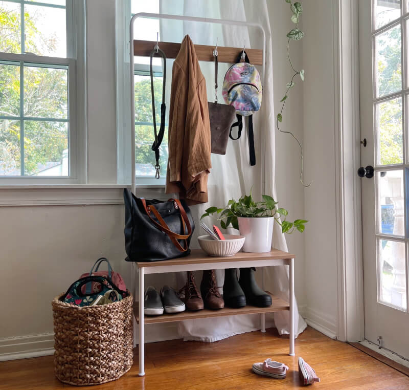 The Ladder Shelf is about two feet wide, so it fits in narrow spots.
