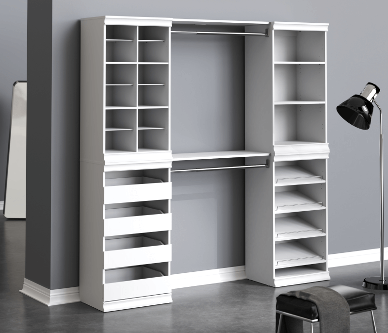 The kit can also serve as the basis for a more robust closet system. You can add drawers and doors to the tower to enhance its function. The system fits closets between 7 and 10 feet wide.